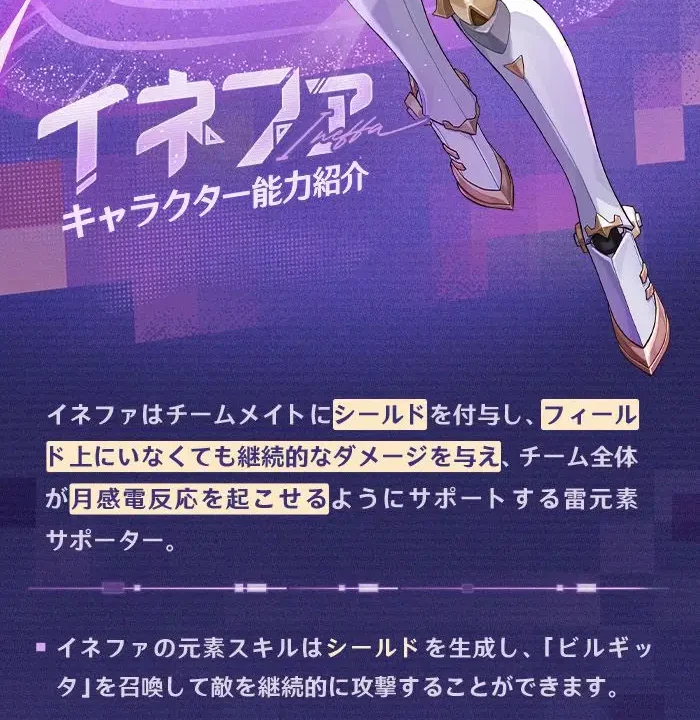 月感電はイネファ固有能力ではなく、今後イネファ以外にも使えるキャラが出るとのこと。